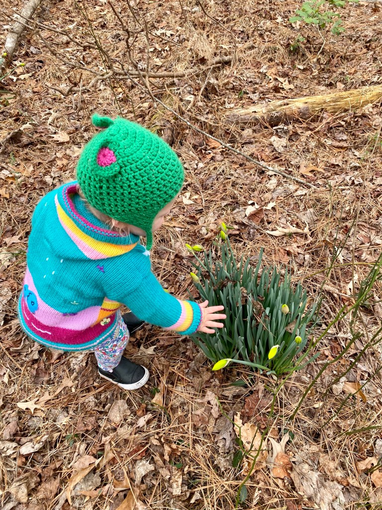 Wild spaces. I am endlessly, profoundly but most of all simply put back in place by wild spaces. The season is turning early this year. Daffodil picking in February? I am sad to think the flowers in the forest that we will lose from the wintery weather tomorrow. I wander all this week back to this, third part of the woods, high ground beyond the elder grove where our fire circle is, closest to the public hunting area where our land meets conservation forest. This is another space, where the volunteer daffodils bloom now, a spring summer place when the forest runs unchecked and wild, that I imagine getting tended. Making into sacred sitting space. Ella, who’s alive and new every heartbeat that happens, mimics me in speaking words of love over our shared space of daffodil earth and air.