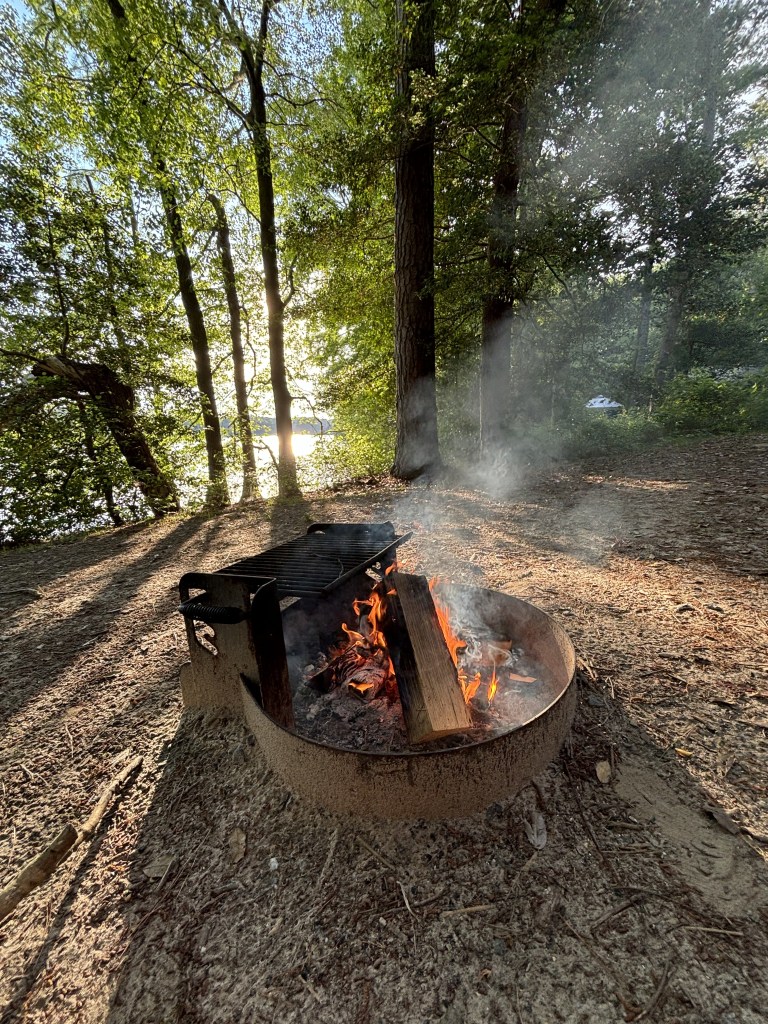 I returned to camping solo in the same place and literally nothing is the same. But for her ancient groundedness. Boy did the mists come over the swamp thick tidewater at twilight the last night I was there. I tended fire two afternoons into sunsets into moonrises in a row for two days. I rode a bike for 45 minutes all around one side of the park and read and read and read and cooked by fire and oh– the first cup of coffee at camp. I took a lovely hour walk on a trail I didn’t know that led to a beach once segregated and vitally important to local black legacy right here on the cypress banks.